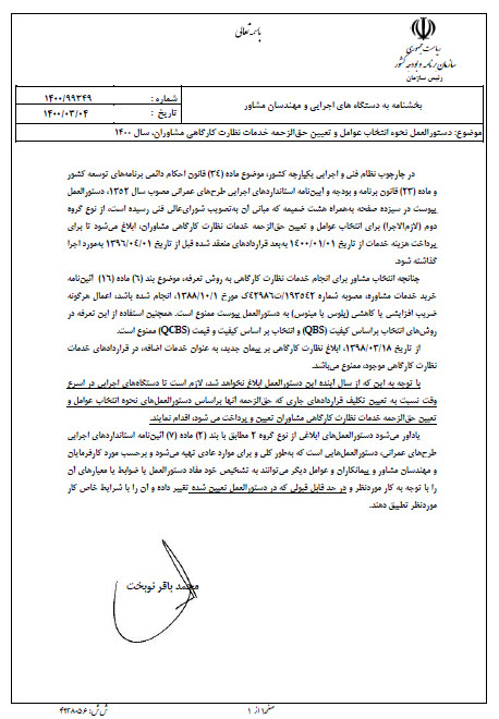 دستورالعمل نحوه انتخاب عوامل و تعيين حقالزحمه خدمات نظارت كارگاهي مشاوران، سال 1400