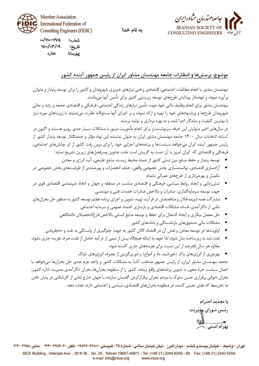 ﭘﺮﺳﺶﻫﺎ و اﻧﺘﻈﺎرات ﺟﺎﻣﻌﻪ ﻣﻬﻨﺪﺳﺎن ﻣﺸﺎور اﯾﺮان از رﺋﯿﺲ ﺟﻤﻬﻮر آﯾﻨﺪه ﮐﺸﻮر