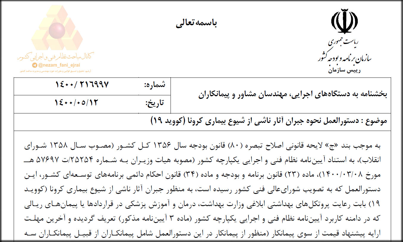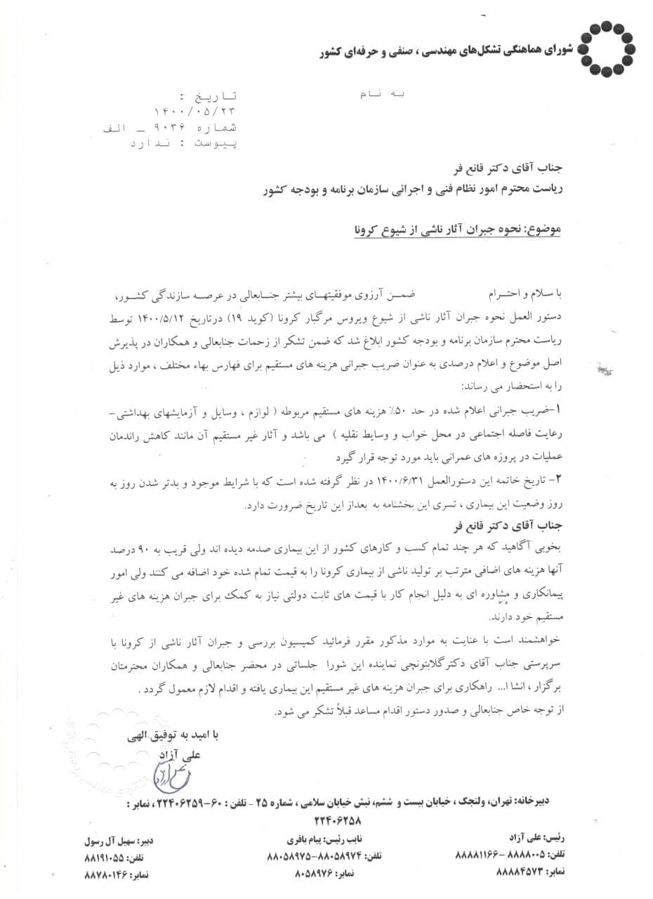 نامه شورای هماهنگی تشکلهای مهندسی و صنفی به آقای دکتر قانع فر در خصوص دستورالعمل نحوه جبران آثار ناشی از شیوع کرونا - تاریخ 1400/5/23