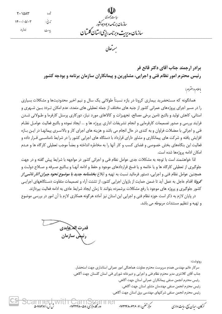نامه رییس سازمان مدیریت استان گلستان به رییس نظام فنی و اجرایی و درخواست تسریع در ابلاغ بخشنامه جبران آثار کرونا :