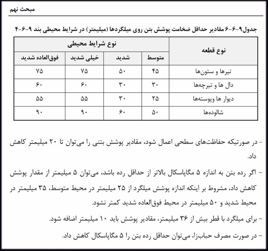 تعريف پوشش بتن: به كوتاهترين فاصله ي سطح بتن از سطح خاموتها و يا سطح آخرين رديف ميلگرد گفته ميشود.