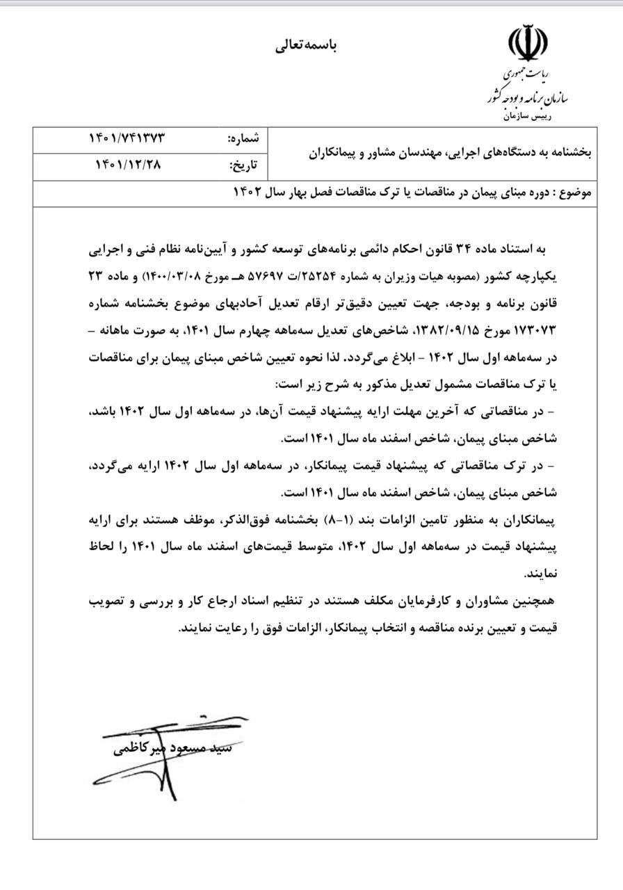 🏗ابلاغ شاخصهای سه ماهه چهارم سال ۱۴۰۱ به صورت ماهانه - دوره مبنای تعدیل پیمان در مناقصات یا ترک مناقصات فصل بهار در سال ۱۴۰۲