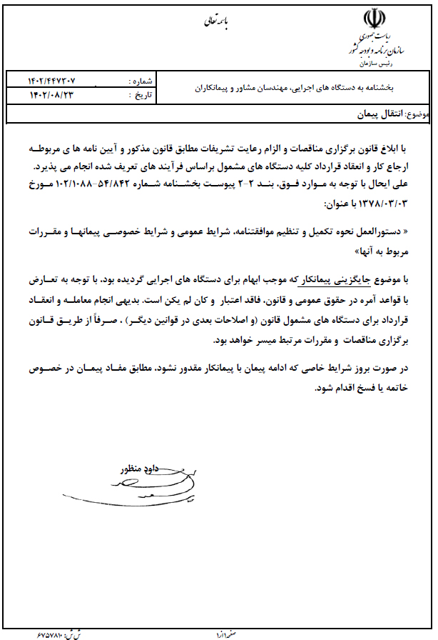 با ابلاغ قانون برگزاري مناقصات و الزام رعايت تشريفات مطابق قانون مذكور و آيين نامه ها ي مربوطه ارجاع كار و انعقاد قرارداد كليه دستگاه هاي مشمول براساس فرآيند هاي تعريف شده انجام مي پذيرد. علي ايحال با توجه به موارد فوق، بند 2-2 پيوست بخشنامه شماره 842/54-1088/102 مورخ 03/03/1378 با عنوان: « دستورالعمل نحوه تكميل و تنظيم موافقتنامه، شرايط عمومي و شرايط خصوصي پيمانها و مقررات مربوط به آنها» با موضوع جايگزيني پيمانكار كه موجب ابهام براي دستگاه هاي اجرايي گرديده بود، با توجه به تعارض با قواعد آمره در حقوق عمومي و قانون، فاقد اعتبار و كان لم يكن است. بديهي انجام معامله و انعقاد قرارداد براي دستگاه هاي مشمول قانون (و اصلاحات بعدي در قوانين ديگر) ، صرفاً از طريق قانون برگزاري مناقصات و مقررات مرتبط ميسر خواهد بود. در صورت بروز شرايط خاصي كه ادامه پيمان با پيمانكار مقدور نشود، مطابق مفاد پيمان در خصوص خاتمه يا فسخ اقدام شود.