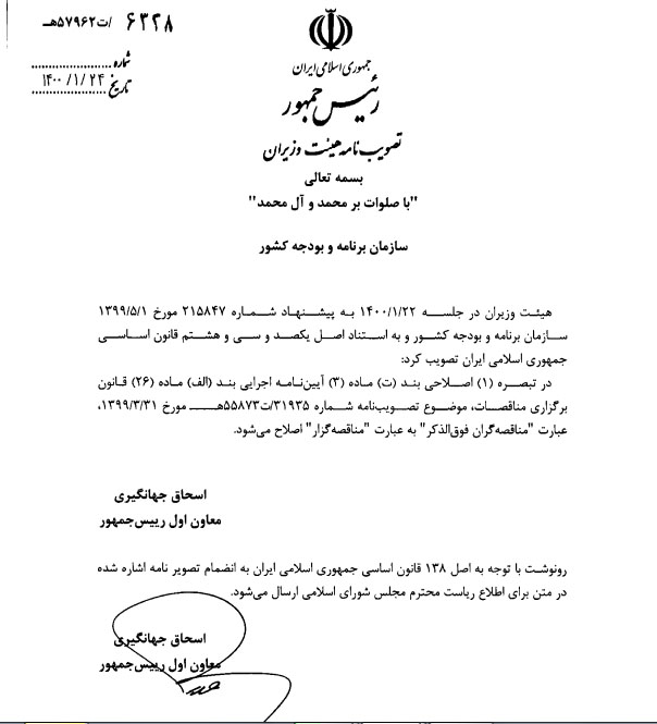 اصلاح تبصره (۱) بند (ت) ماده (۳) آييننامه اجرايي بند (الف) ماده (۲۶) قانون برگزاري مناقصات