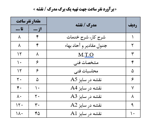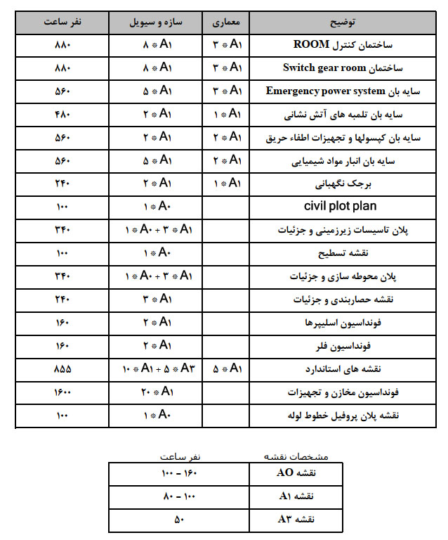 جداول ذیل نشان دهنده میزان نفر - ساعت مورد نیاز جهت تهیه یک مدرک یا نقشه می باشد که حاصل تجربه یک تیم مهندسی در طول چند سال اخیر بدست آمده است. لذا موارد درج شده در جدول قانون و مصوب و معتبر (منبع و مرجع) نبوده و فقط بیان تجربه یک تیم مهندسی ناشی از تجربیات اخیر در پروژه های خود می باشد که قابل استناد نیست. شاید بعنوان مبنا یا راهنمایی برای محاسبات آتی همکاران عزیزم بدرد بخور باشد.