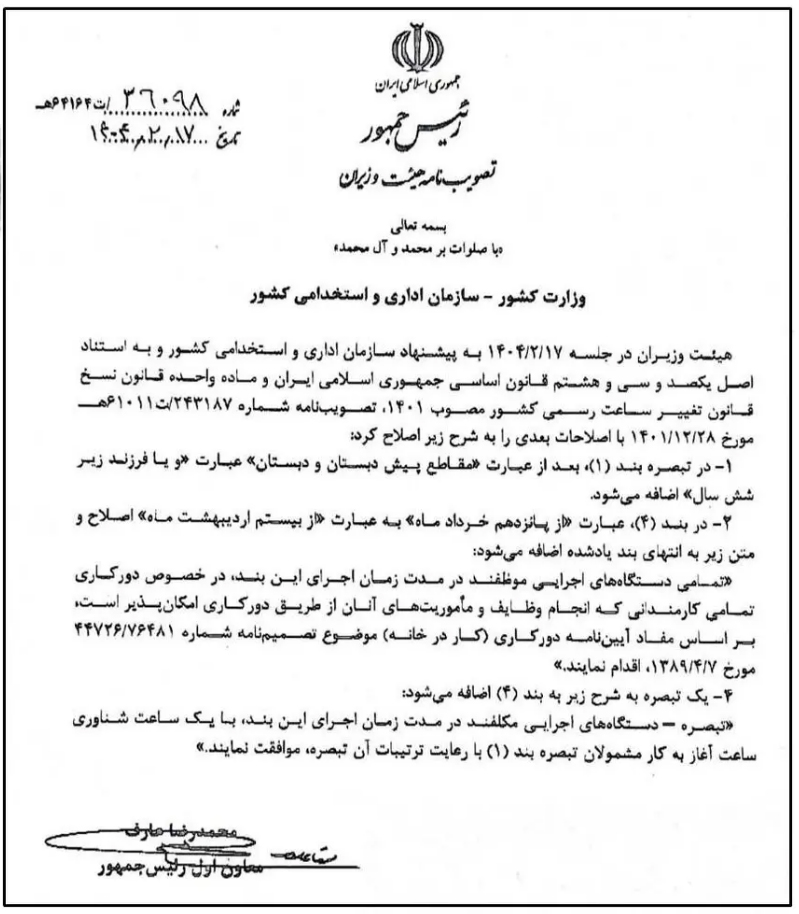 هیئت وزیران در جلسه ۱۷/۲/۱۴۰۴ به پیشنهاد سازمان اداری و استخدامی کشور و به استناد اصل یکصد و سی و هشتم قانون اساسی جمهوری اسلامی ایران و ماده واحده قانون نسخ قانون تغییر ساعت رسمی کشور مصوب ۱۴۰۱، تصویبنامه شماره ۲۴۳۱۸۷/ت۶۱۰۱۱هـ مورخ ۲۸/۱۲/۱۴۰۱ با اصلاحات بعدی را به شرح زیر اصلاح کرد: