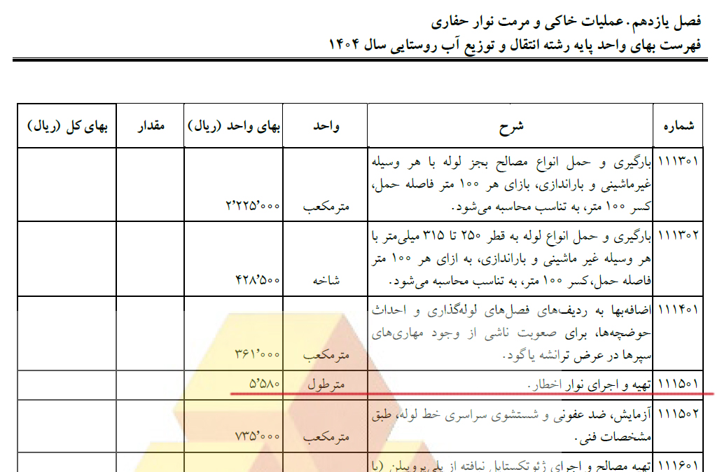 آیتم نوار خط چند باری در فهارس بهای سازمان برنامه نیز تکرار شده. در اکثر پروژه با توجه به وجود این ردیف، نیاز به برآورد یا تهیه صورت وضعیت حس شده است. در ذیل چند مورد از ردیف یا آیتم "نوار خطر" نمایش داده شده است. امید است که مشکلی از یافتن این ردیف در فهارس بهاء برای همکاران محترم کاسته شود.