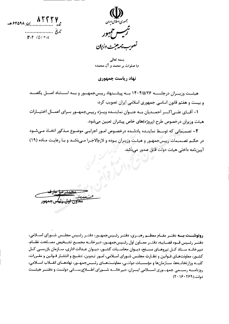 انتخاب نماینده ویژه رئیس جمهور برای تصمیم گیری در خصوص پروژه های خاص